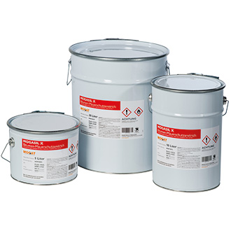 MOGASIL X Wall Protection Coating is a cold-applied, black, solvent-based top coating made from bitumen, available in 5, 10, and 30-liter containers.