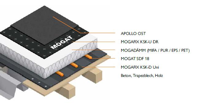 APOLLO O5T is available in the standard colors black or green-white, as well as in other special colors for creative roof design. In addition, the membrane is now also available with NIVIS white, MOGAT’s innovative, highly reflective surfacing.